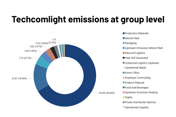 At corporate level, Techcomlight has calculated its complete CO₂ footprint across Scope 1, 2 and 3. This includes not only our own energy consumption and transportation, but also emissions throughout the value chain, such as purchased materials and logistics.